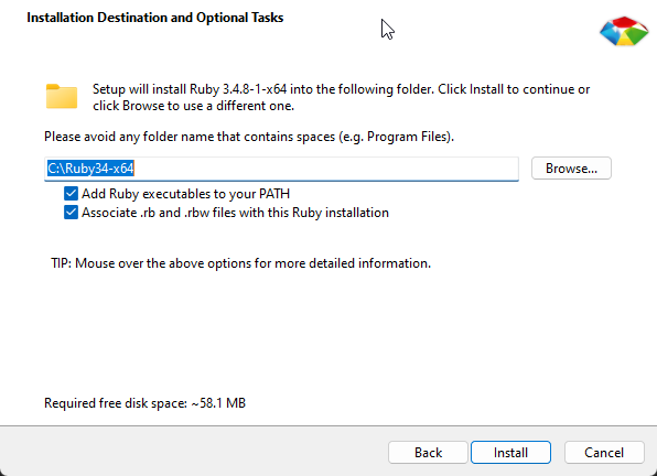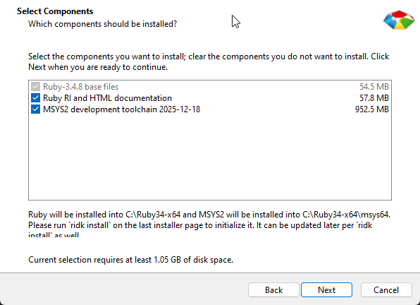- Windows: Download the Ruby+Devkit from RubyInstaller. Choose the “x64” version. During installation, make sure “Add Ruby executables to your PATH” and MSYS2 development toolchain are checked.